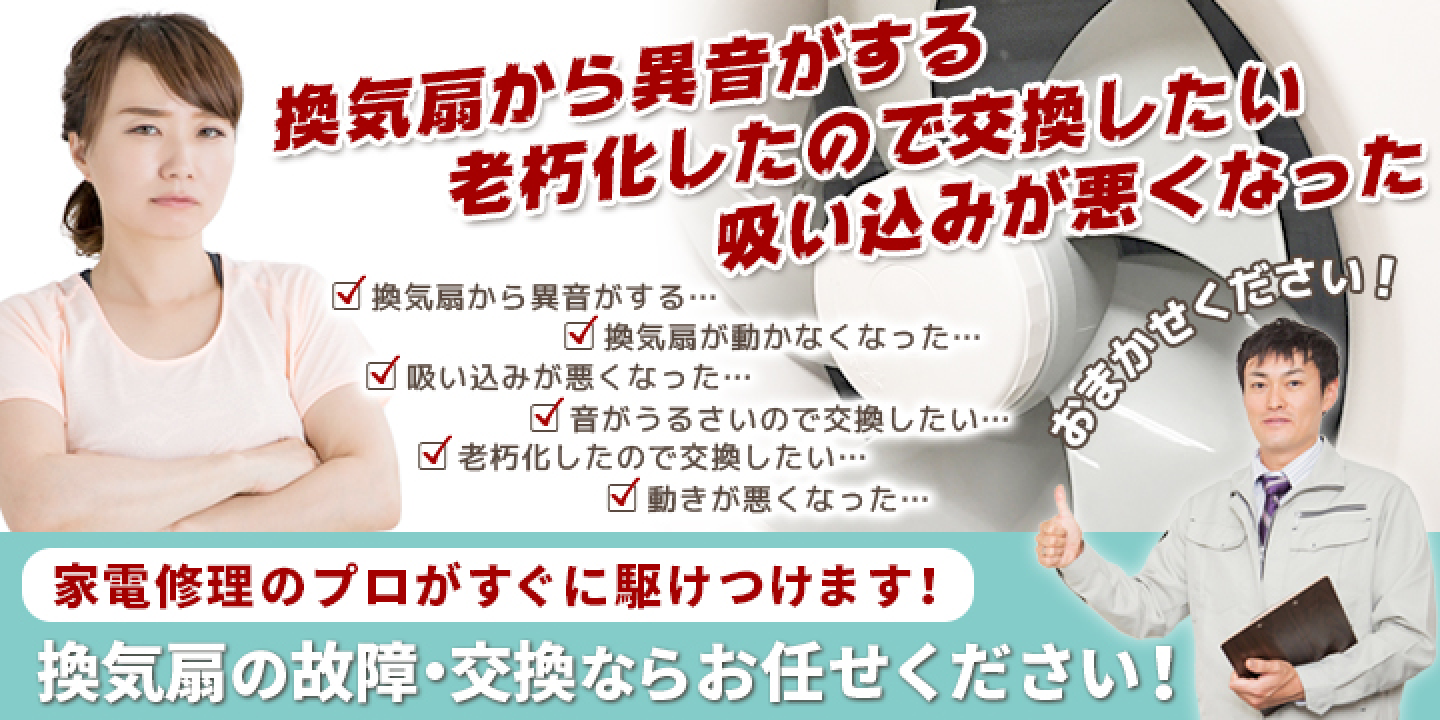 換気扇から異音がする、吸い込みが悪くなった、老朽化したので交換したいなど 故障かな?と思う症状が出たら、家電修理のAOTにまずはお電話ください。 経験豊富な出張修理を行う家電修理のプロフェッショナルが、 あなたの家電の悩みを必ず解消します!